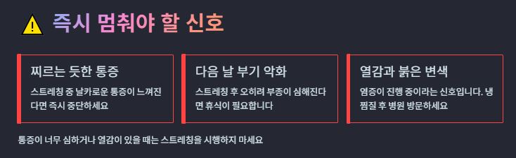 스트레칭 중 찌르는 듯한 통증이 느껴지거나, 다음 날 부기가 더 심해진다면 즉시 중단하고 휴식을 취해야 합니다. 이는 염증이 진행 중이라는 신호일 수 있습니다.