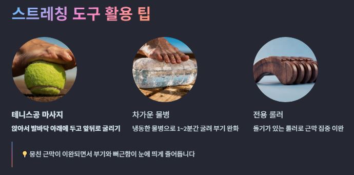 의자에 앉아 발바닥 아래에 테니스공이나 차가운 물병을 두고 앞뒤로 1~2분간 굴려보세요. 뭉친 근막이 이완되면서 부기와 뻐근함이 눈에 띄게 줄어듭니다.