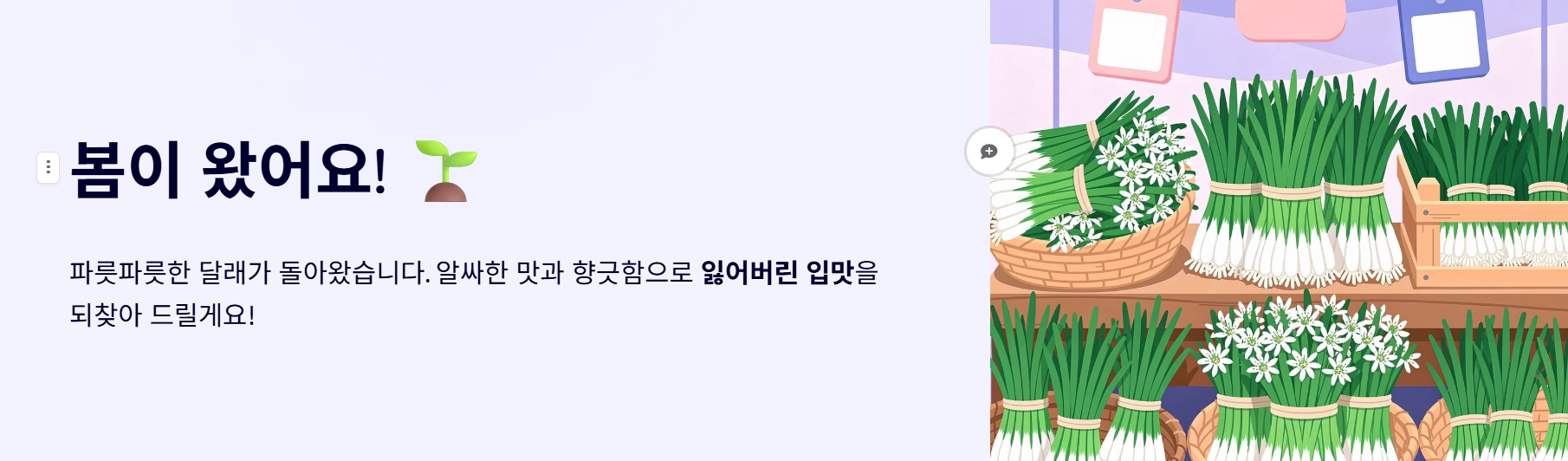 지금까지 봄의 전령사, 달래장 만드는 법을 함께 알아봤습니다. 오늘 저녁엔 향긋한 달래장 하나로 가족들과 함께 봄의 식탁을 만끽해 보시는 건 어떨까요? 레시피대로 만드시면 분명 "오늘 밥맛 정말 좋다!"라는 칭찬을 들으실 거예요.