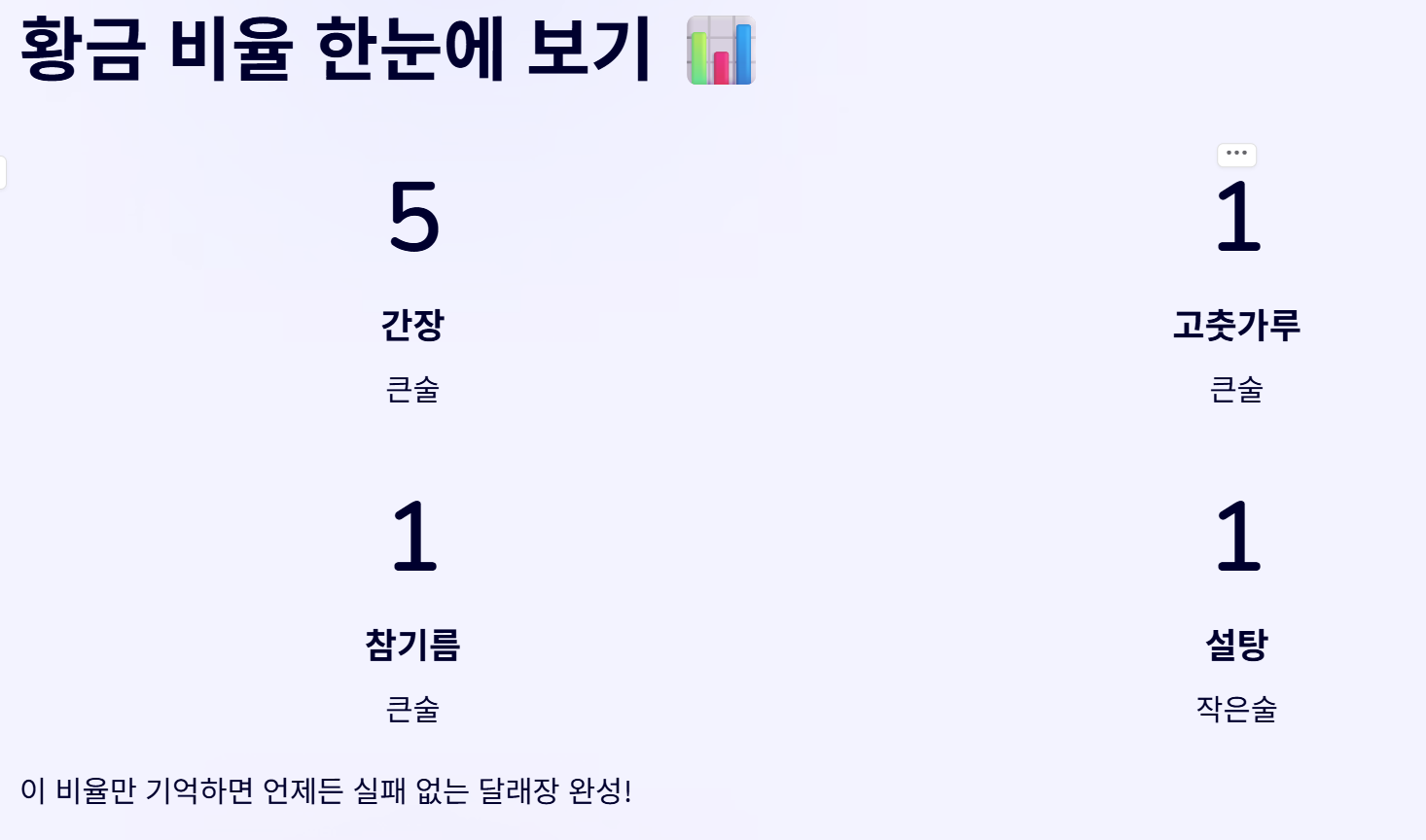 | 기본 양념 | 진간장 5큰술, 고춧가루 1큰술, 다진 마늘 0.5큰술, 설탕 1작은술 |