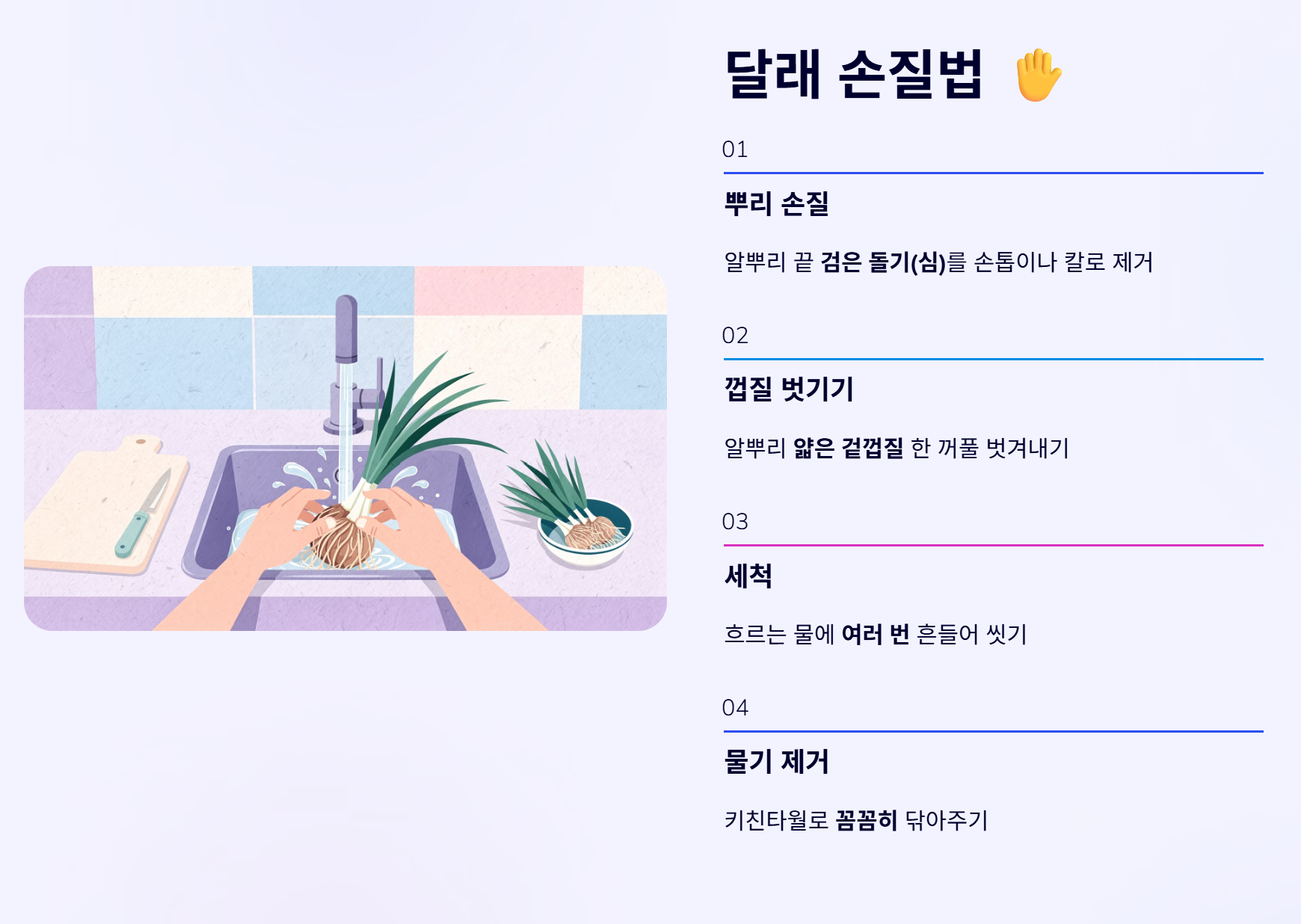 - 세척: 흐르는 물에 여러 번 흔들어 씻으며 흙과 이물질을 완전히 제거합니다.