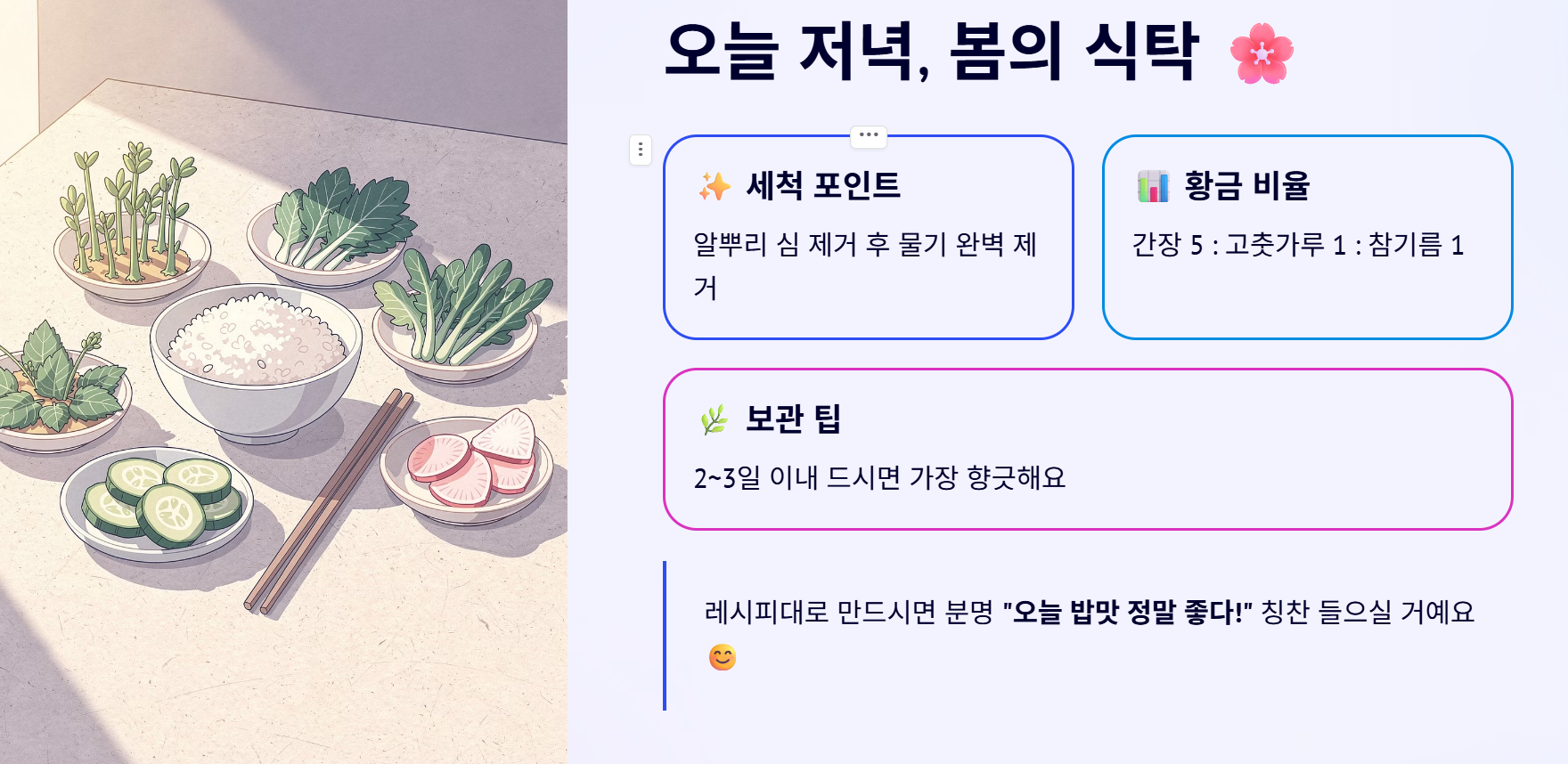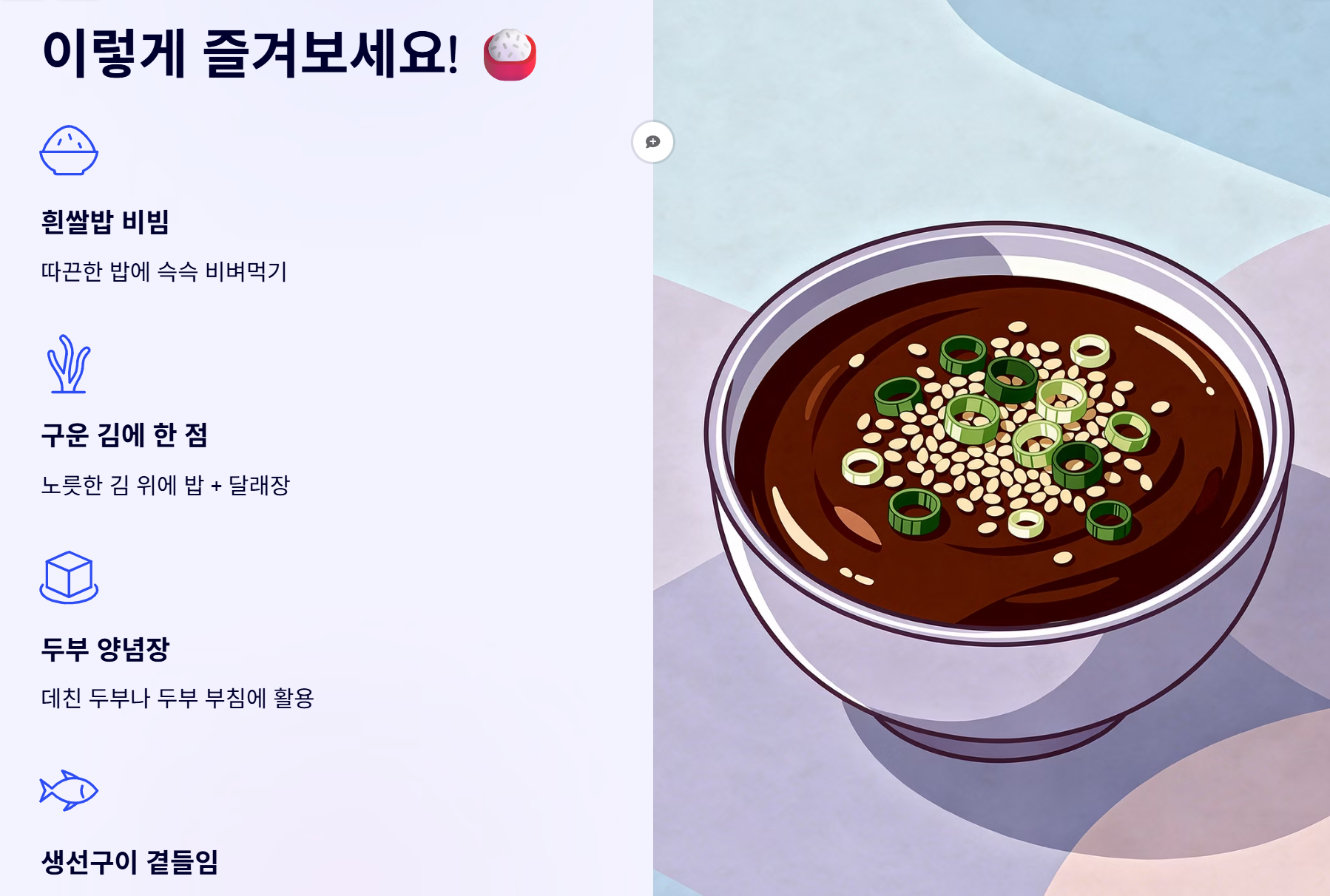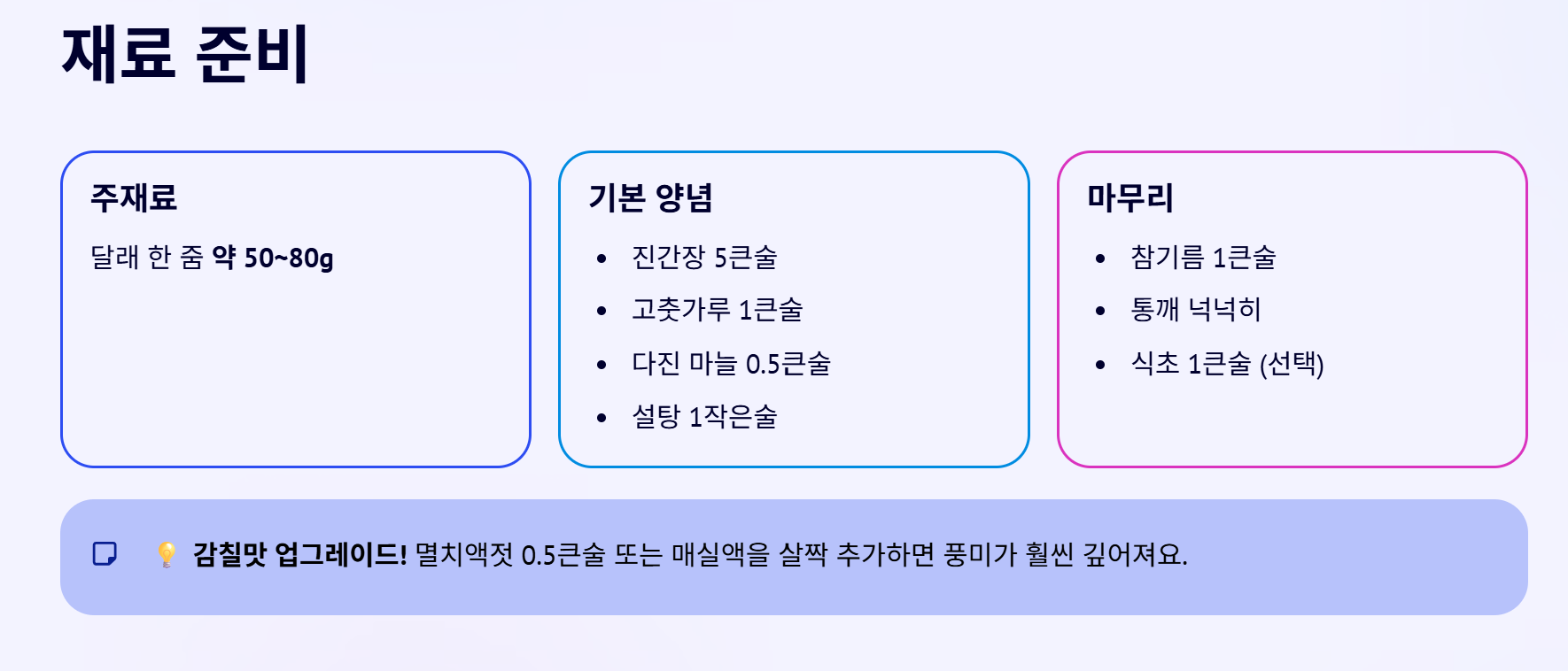 맛있는 요리의 시작은 정확한 재료 준비부 터겠죠? 달래장은 기본양념만으로도 충분히 맛있지만, 몇 가지 포인트를 더하면 훨씬 깊은 풍미를 느낄 수 있습니다.