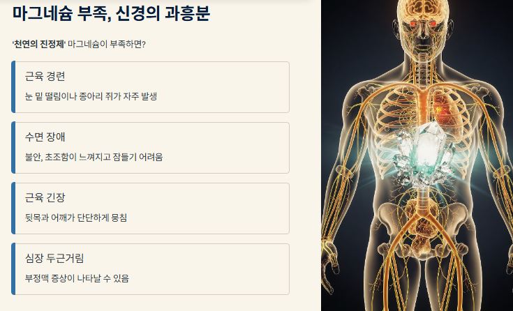 마그네슘은 '천연의 진정제'라 불릴 만큼 신경 안정과 근육 이완에 필수적입니다. 부족할 경우 세포 내 전해질 균형이 깨지면서 근육이 떨리거나 수면 장애가 발생하게 됩니다.
