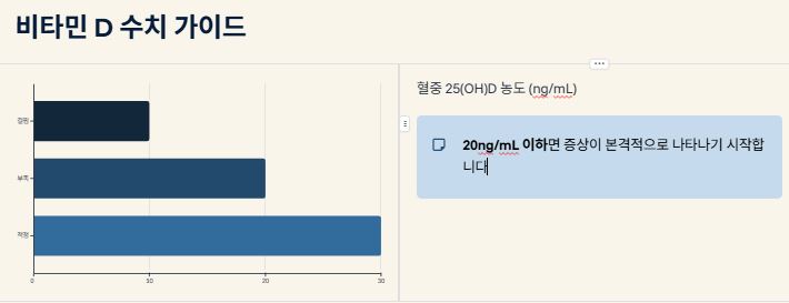 혈중 25(OH)D 농도가 10ng/mL 미만이면 결핍, 20ng/mL 이하면 부족 상태로 간주하며 증상이 본격적으로 나타나기 시작합니다.