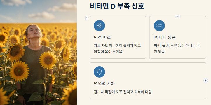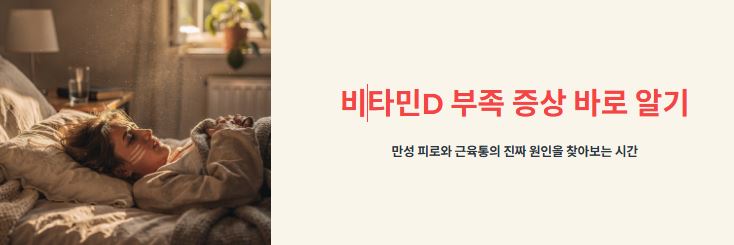 - 비타민 D 부족은 만성 피로, 면역 저하, 뼈의 통증을 유발합니다.