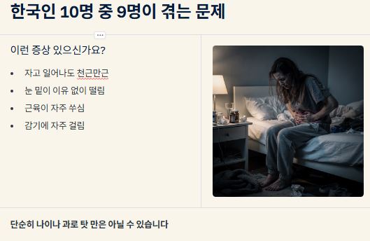 - 초기 증상: 자도 자도 피곤함이 풀리지 않고, 아침에 몸이 무겁습니다.
