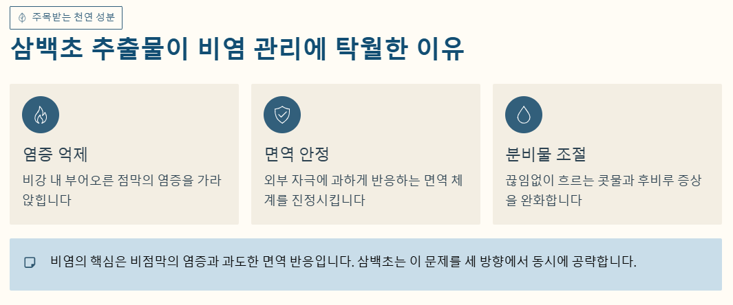 비염의 핵심은 결국 비점막의 염증과 과도한 면역 반응입니다. 삼백초 추출물은 이 문제의 원인을 세 가지 방향에서 동시에 공략합니다.