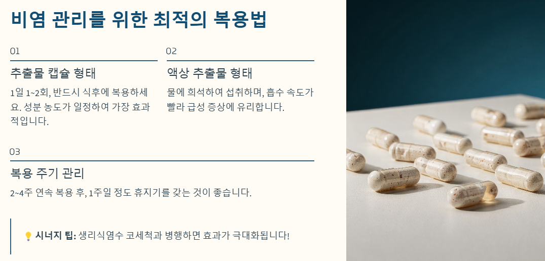 - 액상 추출물: 물에 희석하여 섭취하며, 흡수 속도가 빨라 급성 증상에 유리합니다.