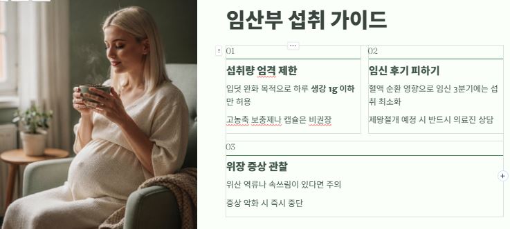 | 섭취 형태 | 농축액, 생강청, 캡슐 등 고농축 제품은 피하고 무가당 차 형태로 마셔야 합니다. |