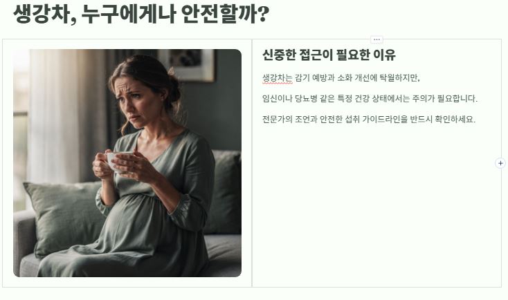 - 위장 장애 악화: 임신 중 위산 역류나 속쓰림이 있다면 생강의 자극성으로 증상이 악화될 수 있으니 주의해야 합니다.