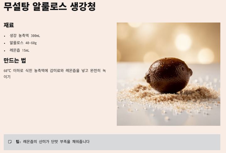 - 재료: 생강 농축액 (300mL), 알룰로스 (40~60g), 레몬즙 (15mL)