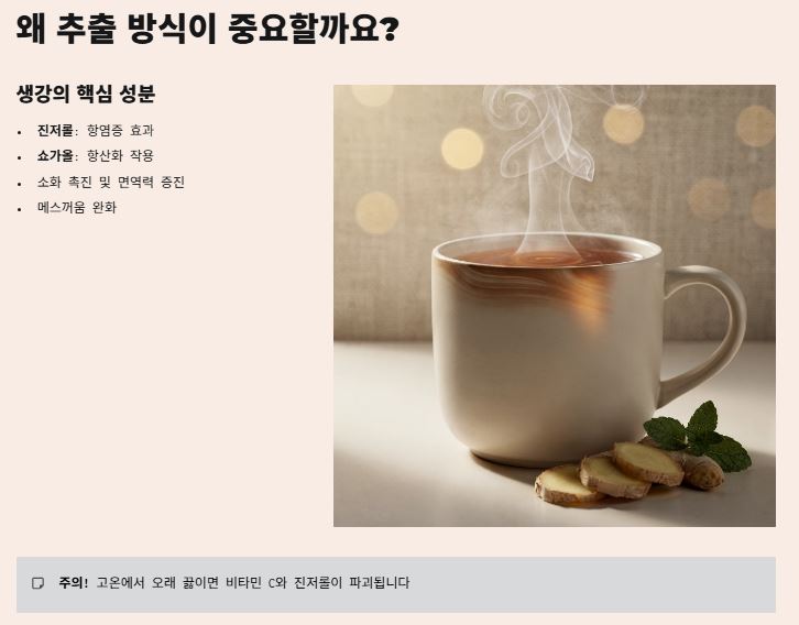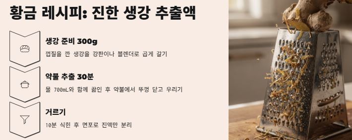 - 생강 추출 방식: 생강은 갈아서 사용해 농도를 높이고, 약불에서 30분 이내로 짧게 우려내 영양소 파괴를 최소화합니다.