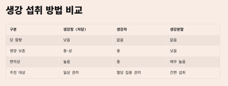 결론적으로, 일상적인 면역 및 기침 관리를 위해서는 저당 생강청이 편리하고, 혈당 관리에 가장 집중한다면 생강차나 생강분말을 활용하는 것이 더 좋습니다.