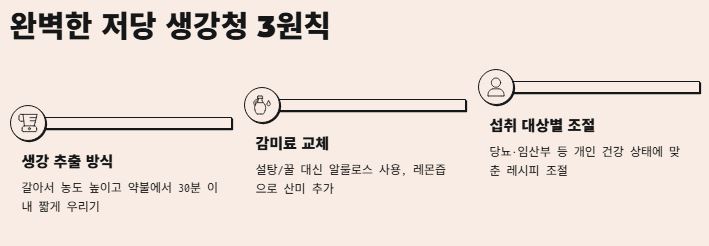 지금까지 이야기한 저당 생강청 만들기의 핵심만 쏙 뽑아서 다시 한번 정리해 드릴게요. 이 3가지 원칙만 기억하면 실패 없이 건강한 생강청을 만들 수 있습니다.
