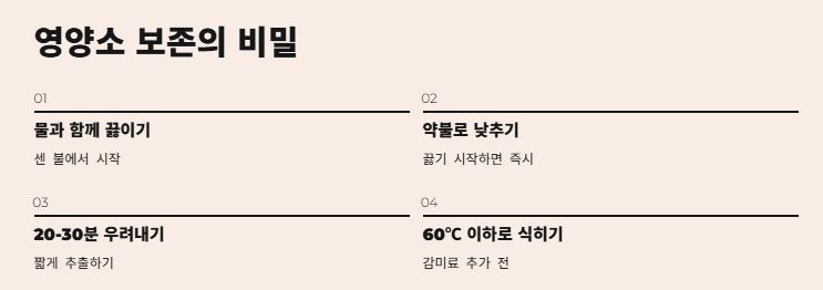 | 영양 보존 | 중~상 (추출 온도 관리 시) | 중 | 낮음 (가공 시 손실 가능) |