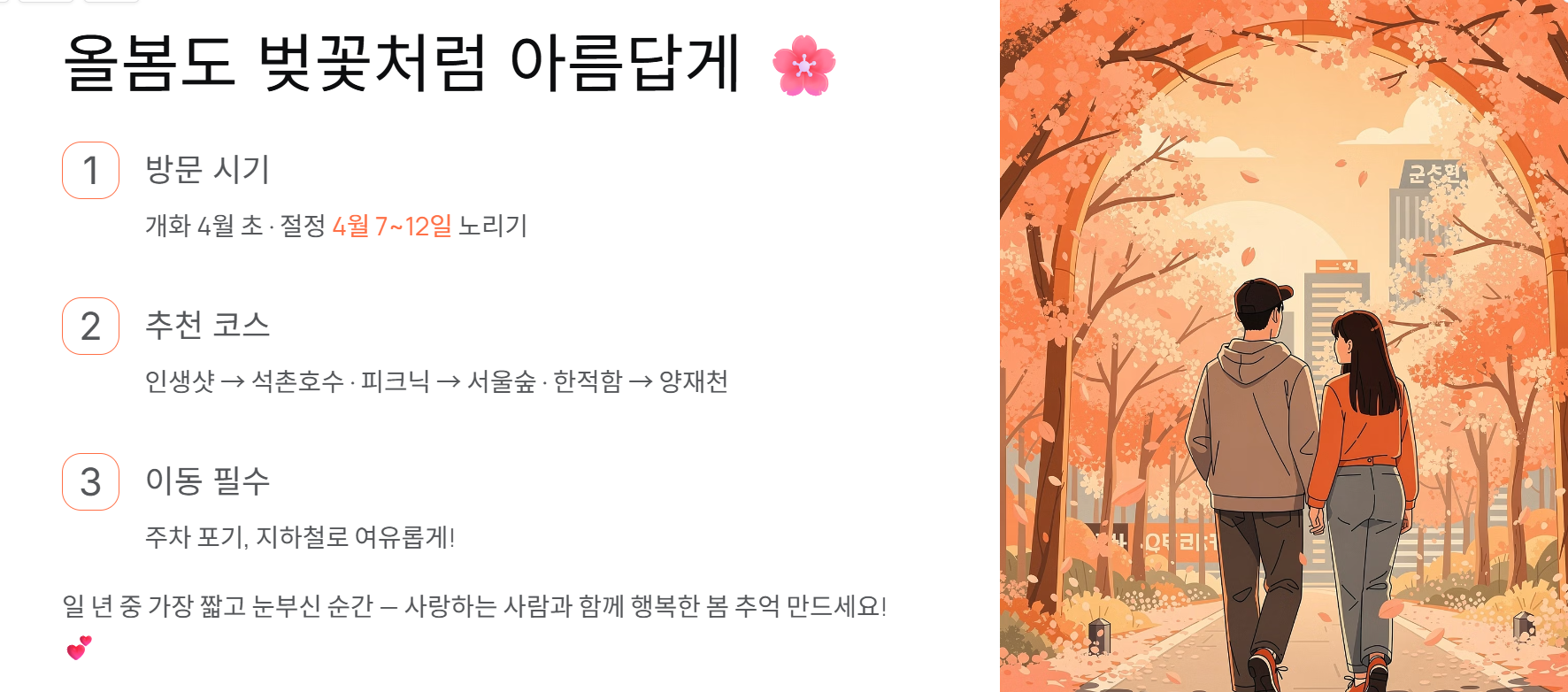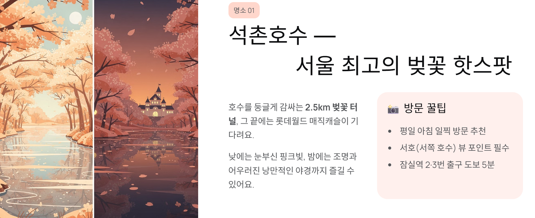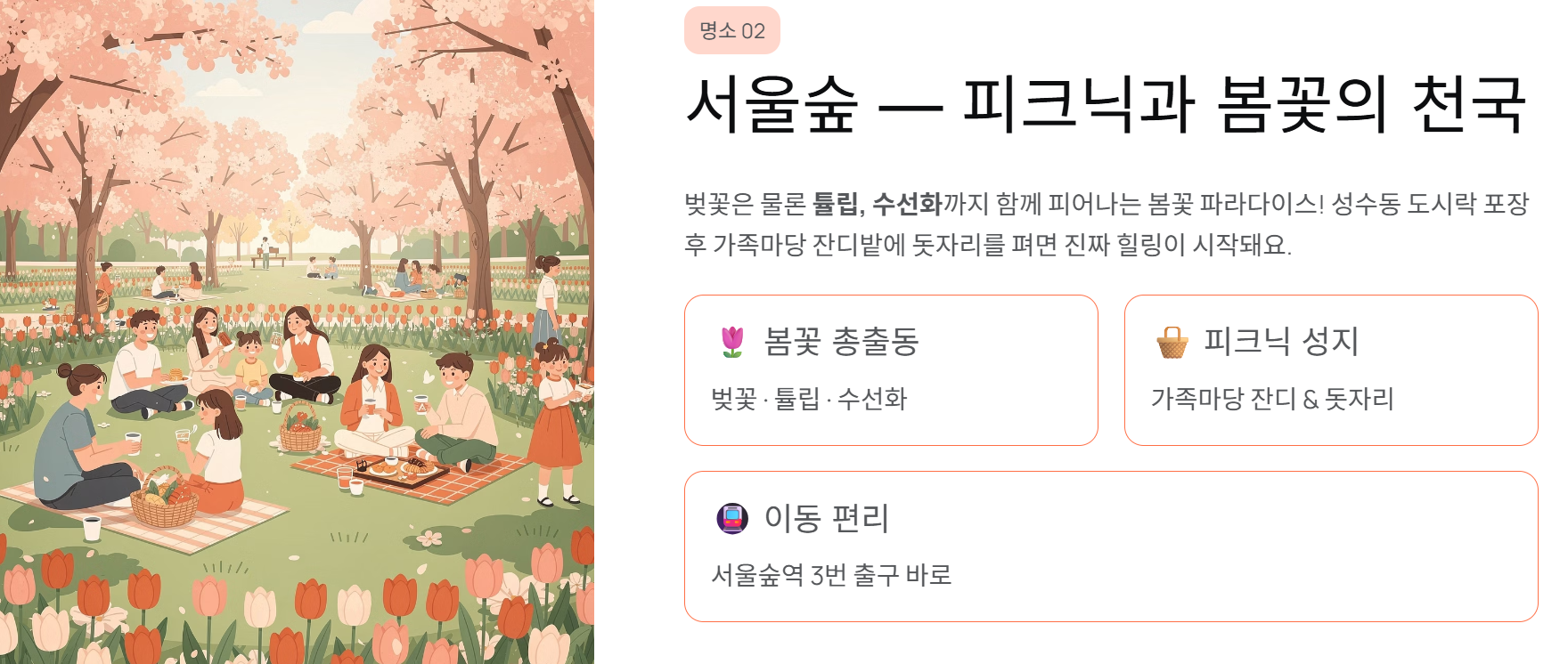 - 추천 코스: 인생샷은 '석촌호수', 피크닉은 '서울숲', 한적한 산책은 '양재천'!