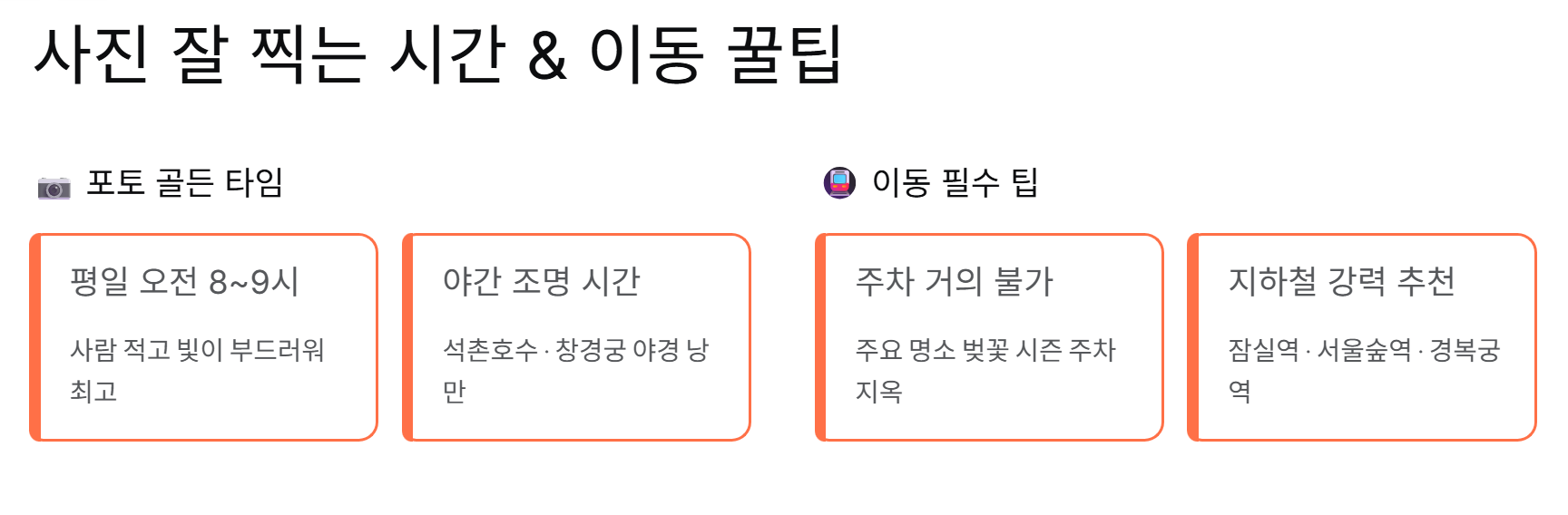 벚꽃 시즌 주요 명소(잠실, 서울숲 등)는 주차가 거의 불가능에 가깝습니다. 대중교통 이용이 정신 건강(?)에 훨씬 이로워요. 잠실역, 서울숲역, 경복궁역 등 지하철 접근성이 매우 좋으니 지하철을 이용해 주세요!