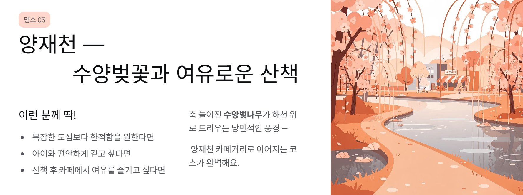 | 양재천 | 수양벚나무와 길게 이어진 수변길 | 여유로운 산책과 카페거리 데이트 |