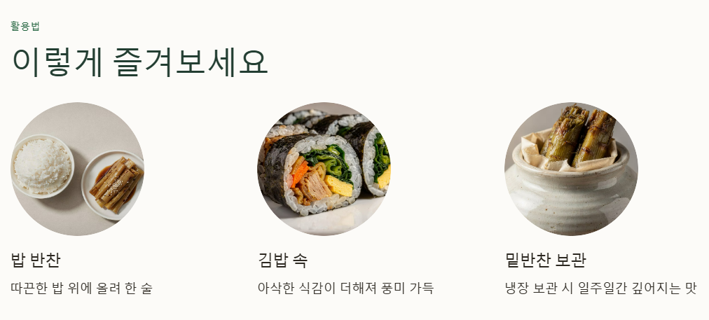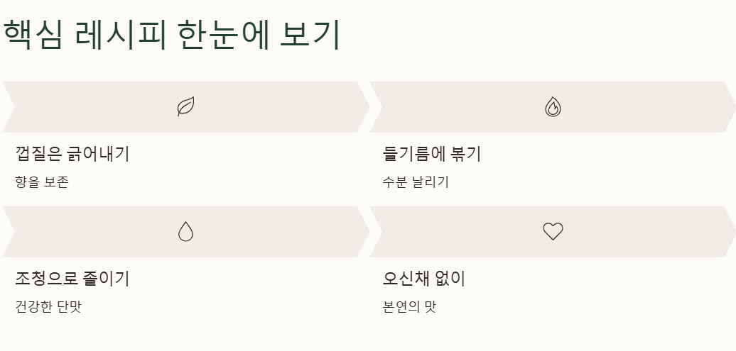 | 양념재료 | 간장 3큰술, 조청(또는 현미엿) 2큰술, 들기름 1큰술, 참깨 |