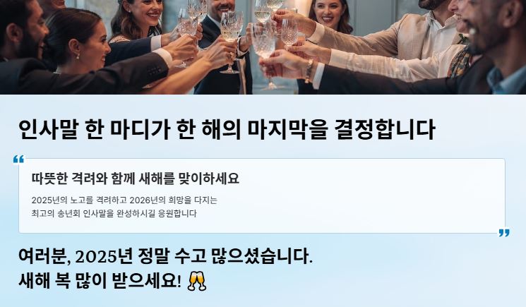한 해의 끝을 알리는 12월, 직장인들에게 송년회는 단순한 술자리를 넘어 서로의 노고를 격려하고 새 출발을 다짐하는 중요한 자리입니다. 특히 임원, 팀장 또는 대표로 마이크를 잡아야 하는 분들이라면, 어떤 인사말을 해야 한 해의 마무리를 깔끔하고 감동적으로 장식할 수 있을지 고민이 클 수밖에 없죠.