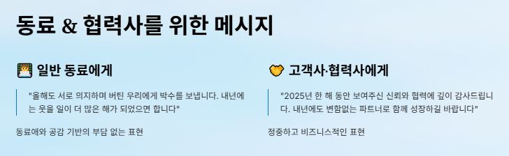- “2025년 한 해 동안 보여주신 신뢰와 협력에 깊이 감사드립니다. 내년에도 변함없는 파트너로 함께 성장하길 바랍니다.” (→ 가장 공식적이며 정중한 비즈니스 인사말)