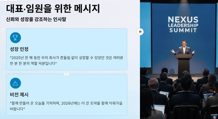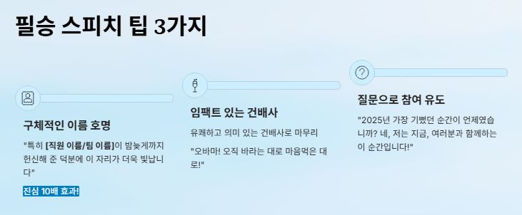 - 3. '질문'으로 청중 참여 유도: "2025년 가장 기뻤던 순간이 언제였습니까? (잠시 뜸 들이기) 네, 저는 지금, 여러분과 함께하는 이 순간입니다!"와 같이 질문을 던져 집중도를 높여보세요.