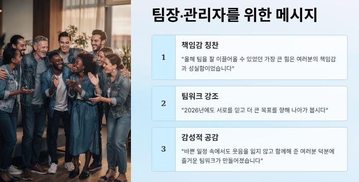 - “올해 팀을 잘 이끌어올 수 있었던 가장 큰 힘은 여러분의 책임감과 성실함이었습니다. 2026년에도 서로를 믿고 더 큰 목표를 향해 나아가 봅시다.” (→ 팀 성과의 공을 구성원에게 돌리며 신뢰 전달)