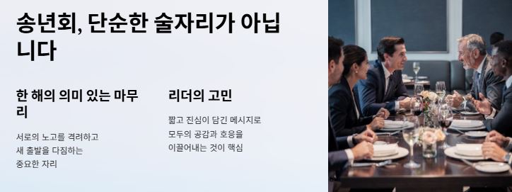 - 지나치게 무거운 분위기는 피하기: 송년회는 공식적인 업무의 연장이기보다는 '격려와 감사'를 나누는 자리입니다. 무거운 반성이나 과도한 부담감 대신 긍정적인 메시지를 전달하세요.