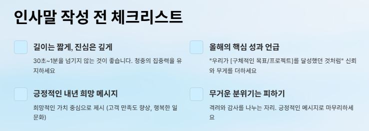 - 올해의 핵심 성과 1~2개 언급: "우리가 [구체적인 목표/프로젝트]를 달성했던 것처럼"처럼 올해의 성과를 짧게 언급하면 메시지에 신뢰와 무게가 더해집니다.