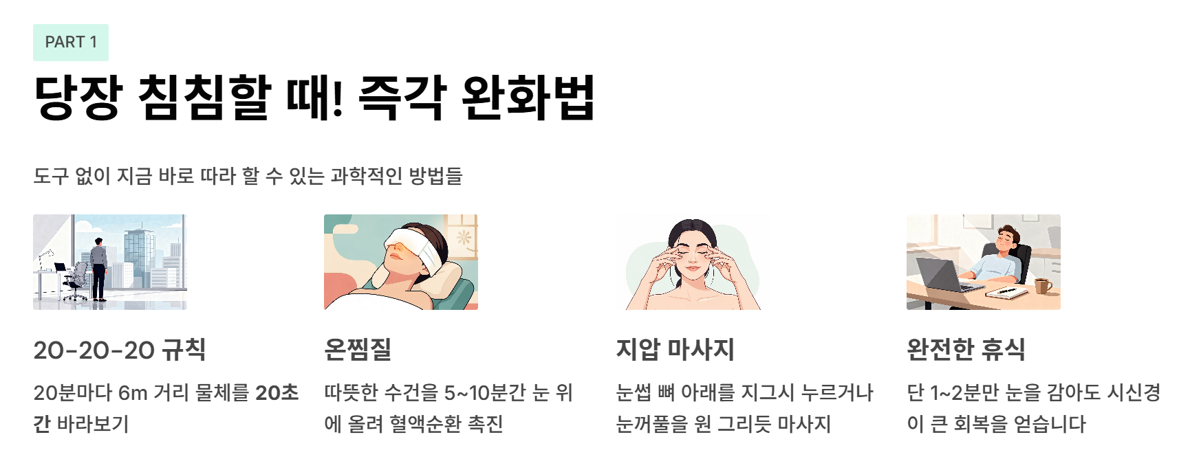 눈에 쌓인 피로를 즉시 덜어낼 수 있는 가장 간단하면서도 과학적인 방법들입니다. 거창한 도구가 없어도 지금 바로 따라 하실 수 있어요.