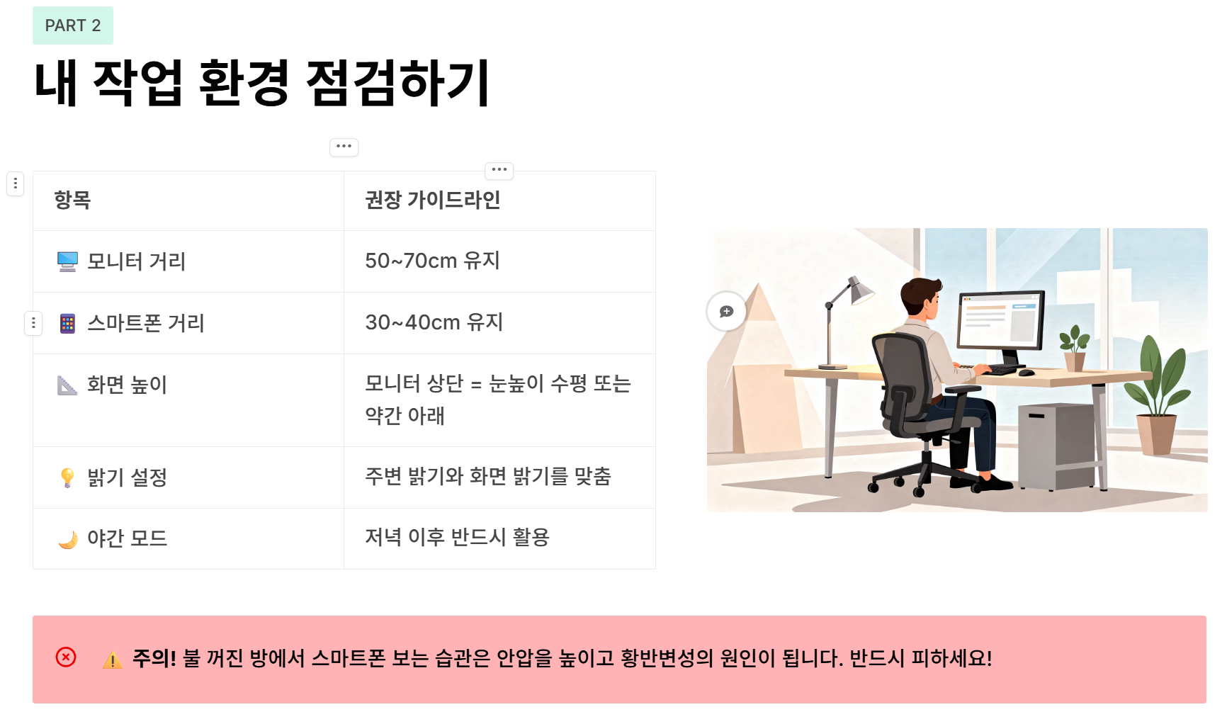 | 화면 거리 | 모니터 50~70cm, 스마트폰 30~40cm 유지 |