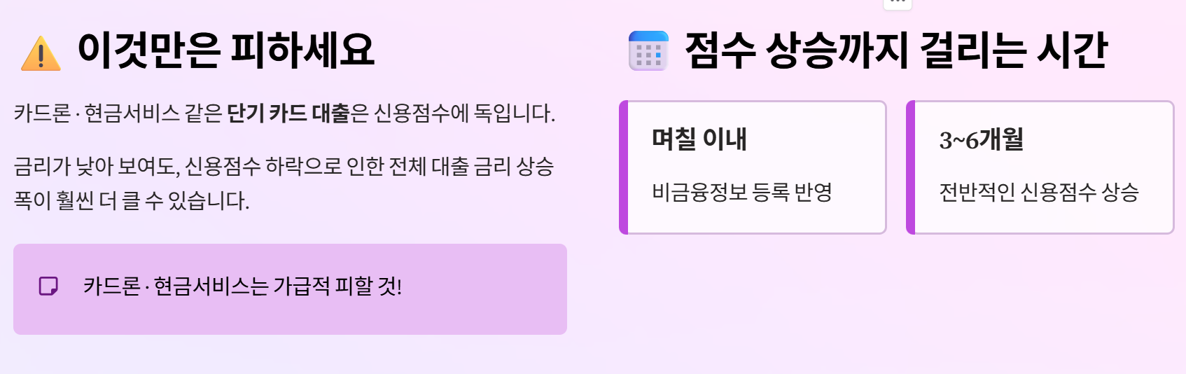카드론이나 현금서비스 같은 단기 카드 대출은 신용점수에 독입니다. 금리가 아무리 낮아 보여도 신용점수 하락으로 인한 전체 대출 금리 상승 폭이 훨씬 클 수 있으니 가급적 피하는 것이 상책입니다.