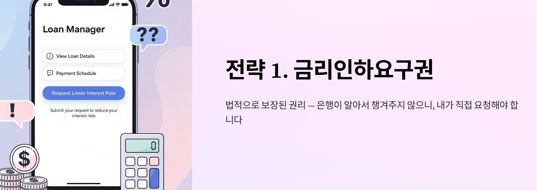 가장 먼저 확인해야 할 것은 법적으로 보장된 우리의 권리, '금리인하요구권'입니다. 이는 대출을 받았을 때보다 신용 상태가 좋아졌다면 은행에 "금리를 내려달라"고 요청할 수 있는 권리예요. 은행이 알아서 챙겨주지 않으니 우리가 직접 움직여야 합니다!