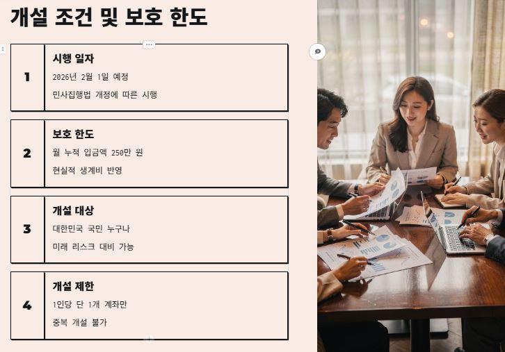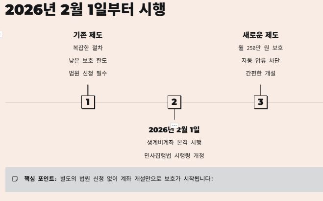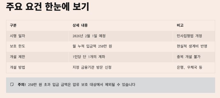 2026년 2월 1일부터 시행되는 이 제도는 월 최대 250만 원까지 압류를 자동으로 차단해줍니다. 별도의 법원 신청 없이 계좌 개설만으로 보호가 시작된다는 점이 가장 큰 장점이에요!