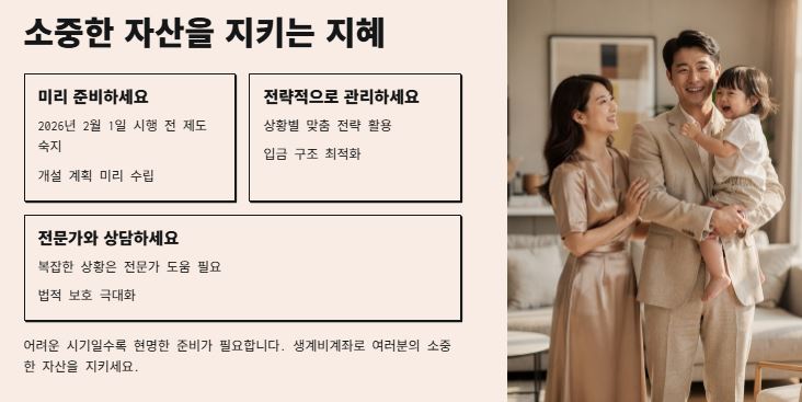 - 직장인: 급여 수령 계좌를 즉시 생계비계좌로 지정하세요. 250만 원 초과분은 다른 일반 계좌로 자동이체되도록 설정하는 것이 리스크 관리의 핵심입니다.