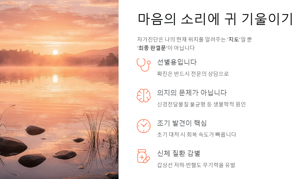 자가진단은 나의 현재 위치를 알려주는 '지도'일뿐, '최종 판결문'이 아닙니다. 점수가 높게 나왔다고 해서 자책할 필요도, 낙인을 찍을 필요도 전혀 없어요.