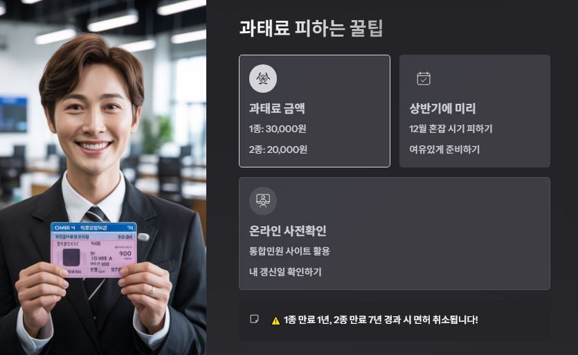 - 과태료 피하기: 1종 면허 만료 1년 경과 시 면허 취소, 과태료 3만 원. 기간이 여유 있을 때 상반기에 미리미리 갱신하는 것이 최고의 팁!