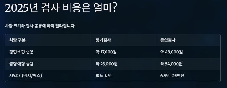 검사 비용은 차량의 크기와 검사 종류(정기/종합)에 따라 달라집니다. 아래는 공단 검사소 기준 일반 요금이며, 지정 정비소(민간)는 업체마다 비용이 조금씩 다를 수 있습니다.