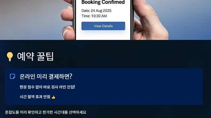 - 현장 접수: 예약 없이 방문도 가능하지만, 대기 시간이 매우 길어질 수 있고 마감 시 검사가 불가능할 수 있으니 주의하세요!