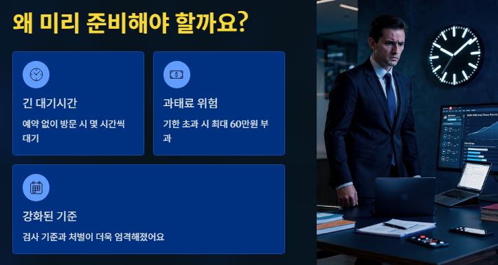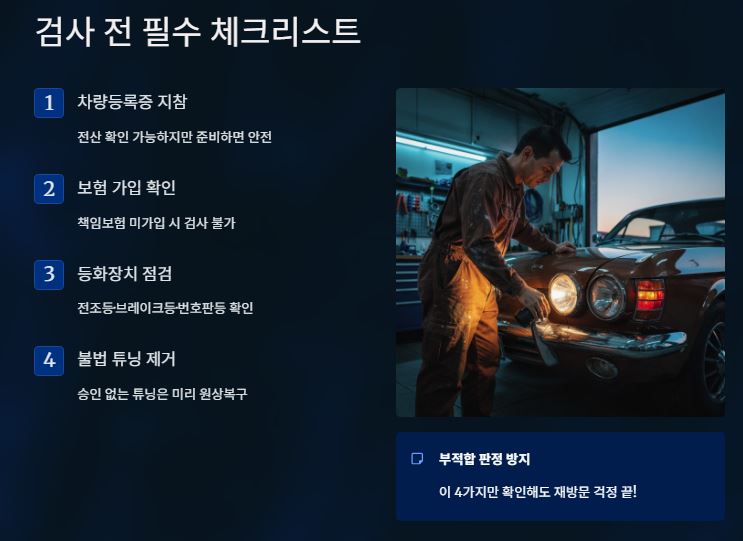 - 불법 튜닝 확인: 승인받지 않은 튜닝 부품이 있다면 미리 원상복구해야 합니다.