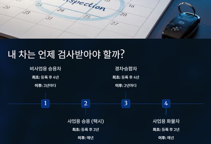 - 경차/승합차: 4년 후 최초 검사 → 이후 2년마다