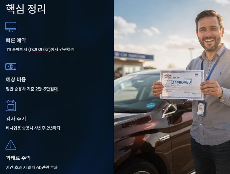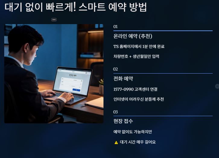 - 온라인 예약 (강력 권장): TS 자동차검사 홈페이지(https://www.cyberts.kr/cp/pvr/prm/readCpPvrPrsecResveMainView.dohttps://www.cyberts.kr/cp/pvr/prm/readCpPvrPrsecResveMainView.do)에 접속하여 차량번호와 생년월일만 입력하면 1분 만에 예약이 가능합니다.