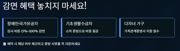장애인, 국가유공자, 기초생활수급자, 다자녀 가구 등은 15%~100%까지 감면 혜택이 있으니, 예약 시 해당 여부를 체크하고 현장에서 증빙 서류를 지참하세요.