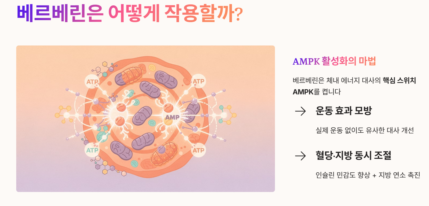 베르베린은 체내 에너지 대사를 조절하는 핵심 효소인 AMPK를 활성화하여 마치 운동을 한 것과 유사한 대사 개선 효과를 나타냅니다.