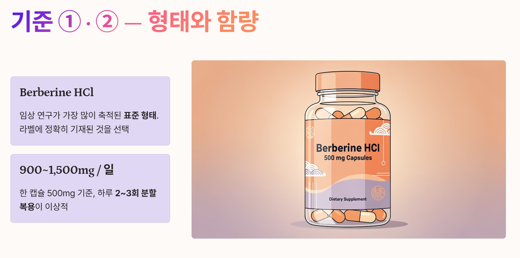 가장 많은 임상 연구를 통해 안전성과 효과가 입증된 형태는 '베르베린 염산염(HCl)'입니다. 제품 라벨에 이 명칭이 정확히 기재된 제품을 선택하는 것이 가장 무난하고 확실합니다.