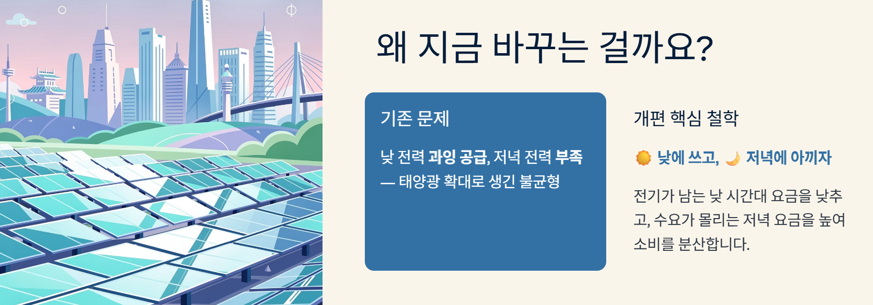 이번 개편의 가장 큰 목적은 에너지 소비 효율화에 있습니다. 그동안 우리나라는 낮 시간대에 전력을 많이 쓴다는 전제하에 요금을 설계해 왔는데요. 최근 태양광 발전이 늘어나면서 낮에는 전력이 남고, 오히려 해가 지는 저녁 시간대에 전력이 부족해지는 현상이 발생하고 있어요.