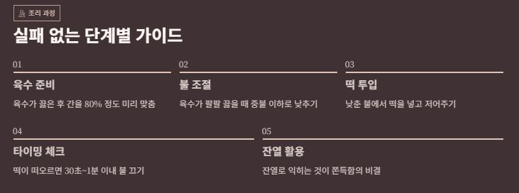 | 육수 준비 | 육수가 끓은 후 간을 80% 정도 미리 맞춤 | 떡 투입 후 간 조절 최소화 |