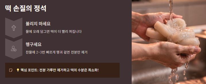 흔히 떡을 물에 오래 담가두시는데, 이는 떡을 더 빨리 퍼지게 만듭니다. 찬물에 2~3번 빠르게 헹궈 겉면의 전분 가루만 제거하는 것이 핵심이에요!