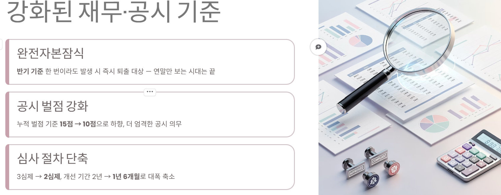 - 공시 벌점: 누적 벌점 기준이 15점에서 10점으로 하향되었습니다.