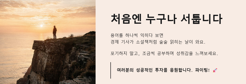 오늘 저와 함께 주식 기초 용어들을 훑어보셨는데 어떠셨나요? 생각보다 어렵지 않죠? ㅎㅎ 용어들을 하나씩 익히다 보면 어느새 경제 기사가 소설책처럼 술술 읽히는 날이 올 거예요. 처음에는 누구나 서투릅니다. 포기하지 말고 조금씩 공부하며 성취감을 느껴보세요!